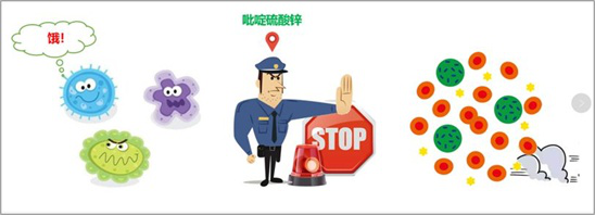 微生物通過離子運輸營養維持生長繁殖,吡啶硫酮通過破壞微生物的該運輸方式,讓營養運輸不進去,使得細菌最終被餓死。同時,鋅離子本身也具有一定的抑菌能力。因此,吡啶硫酮鋅在殺菌的同時,本身并未被消耗,可反復殺菌,具有高效、長效的殺菌能力。